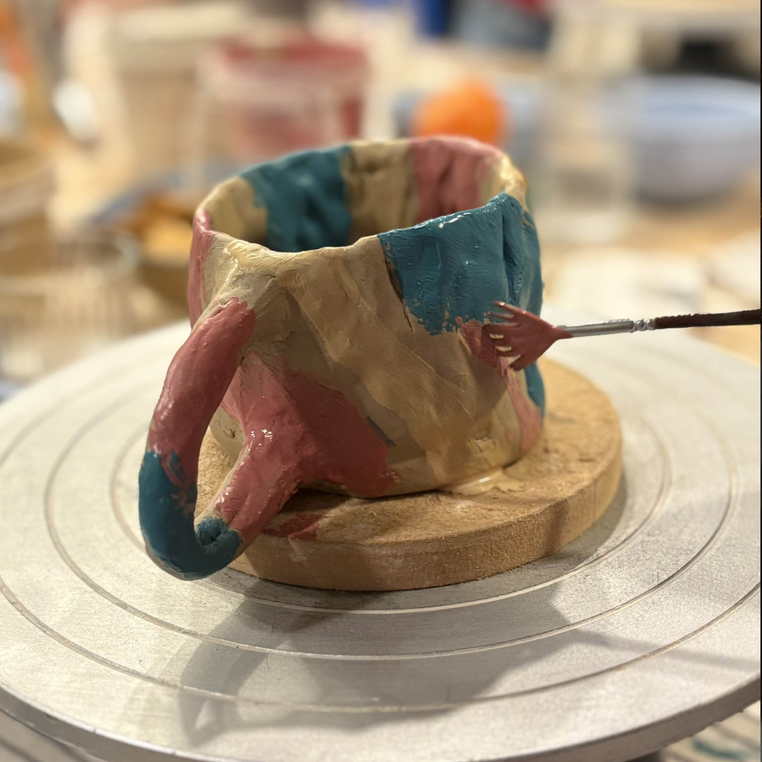 To warsztaty lepienia i zdobienia angobami. Na zajęciach ulepicie 1 wyrób i nadacie mu wybranej barwy. Po warsztatach prace są suszone, następnie wypalane na biskwit i przygotowane do szkliwienia. Następnie wyrób zostaje pokryty szkliwem transparentnym i ponownie wypalony. Finalne prace są gotowe do odbioru po ok. 3 tygodniach.